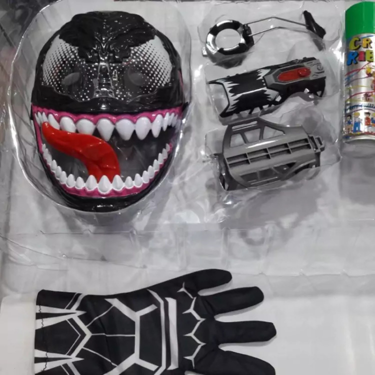 دستکش ونوم همراه ماسک چراغ دار ال ای دی دارد زبون متحرک دستکش اب پاش و بتری برف شادی برای نخ پرت کردن در شیرینی فروشی ها اسپری معمولا هست و پیدا میشه کیفیت بسیار بالایی برخوردار هست مناسب رده سنی 8 سال به بالا